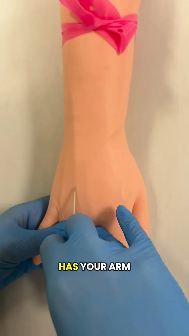 Healthcare worker performing a venipuncture on a simulated hand, using blue gloves and sterile equipment.